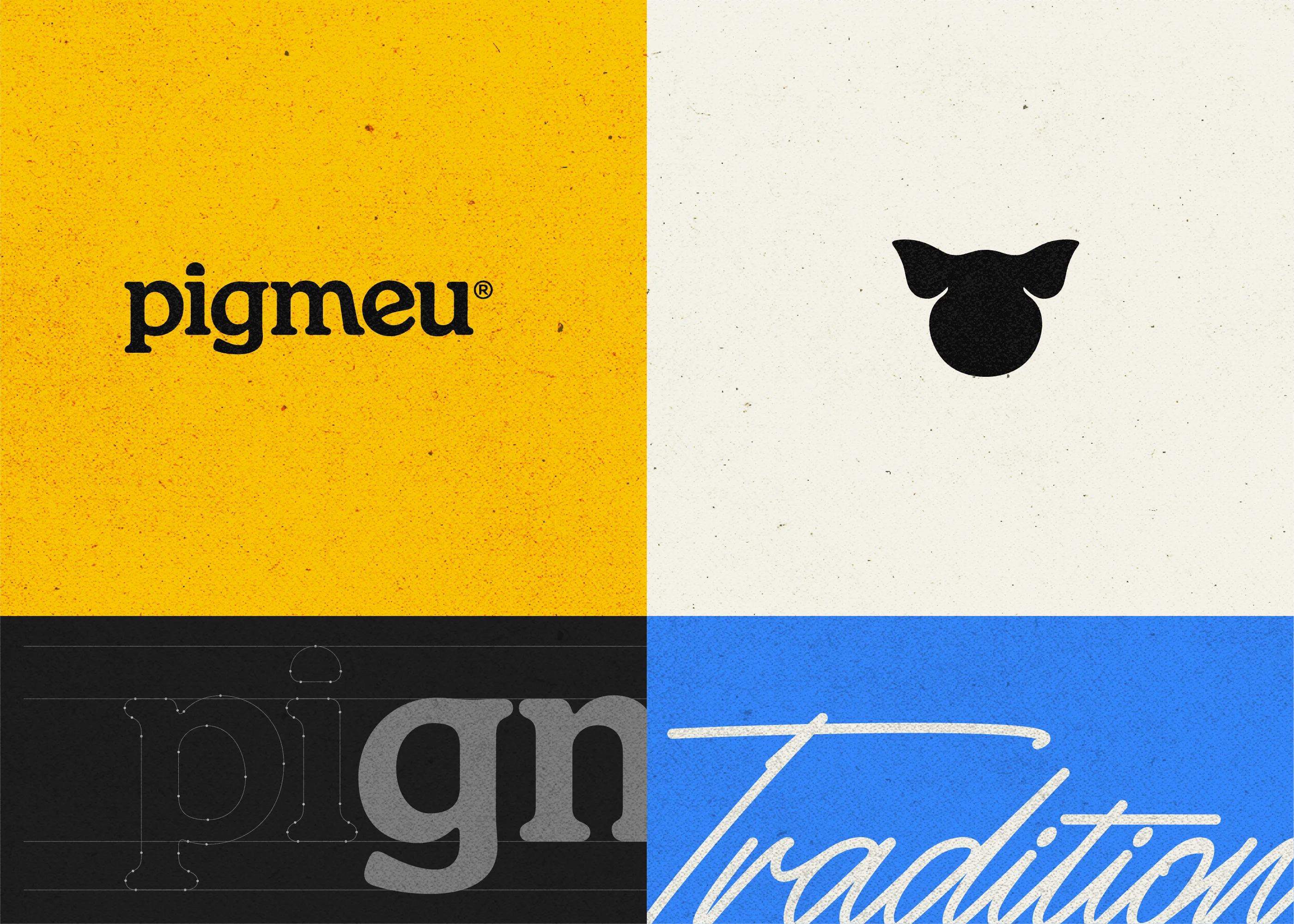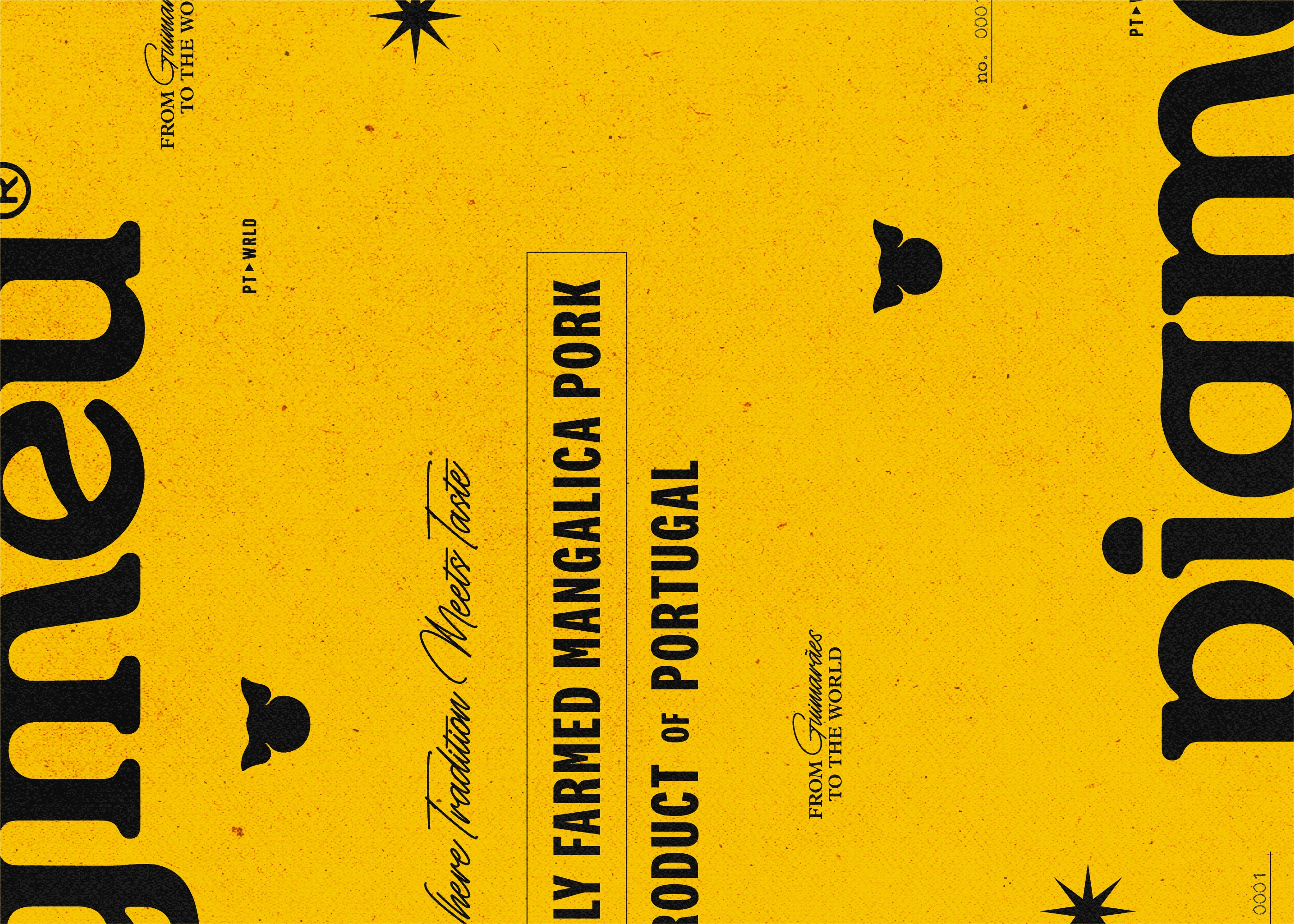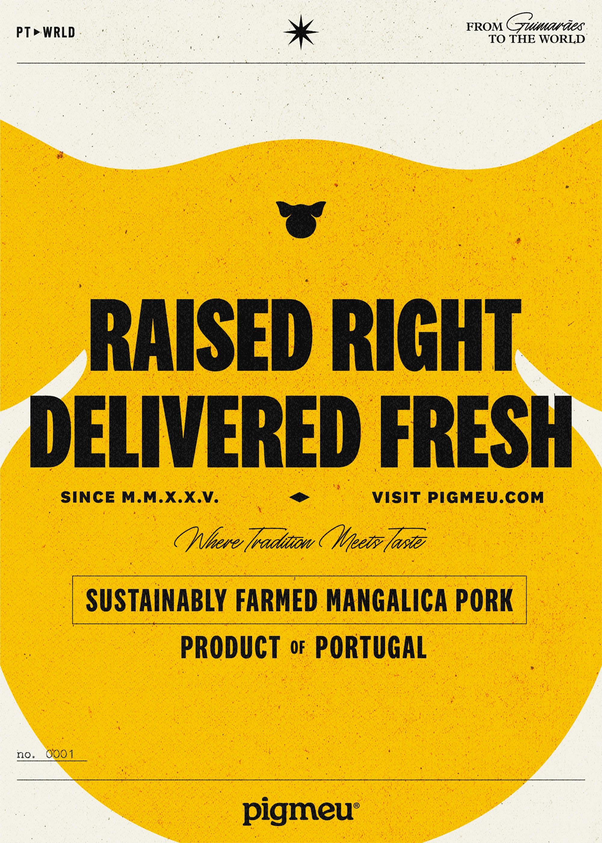Pigmeu introduces a premium heritage breed to Portuguese consumers through a visual identity that refuses to blend in. In a category dominated by rustic, expected aesthetics, the brand leans into a bold letterpress-inspired system: compressed typography, grunge textures, and a color palette that feels more print shop than butcher counter. The tagline "Raised Right. Delivered Fresh." anchors the brand promise in craft and quality machine-printed aesthetic commands attention without relying on category clichés.