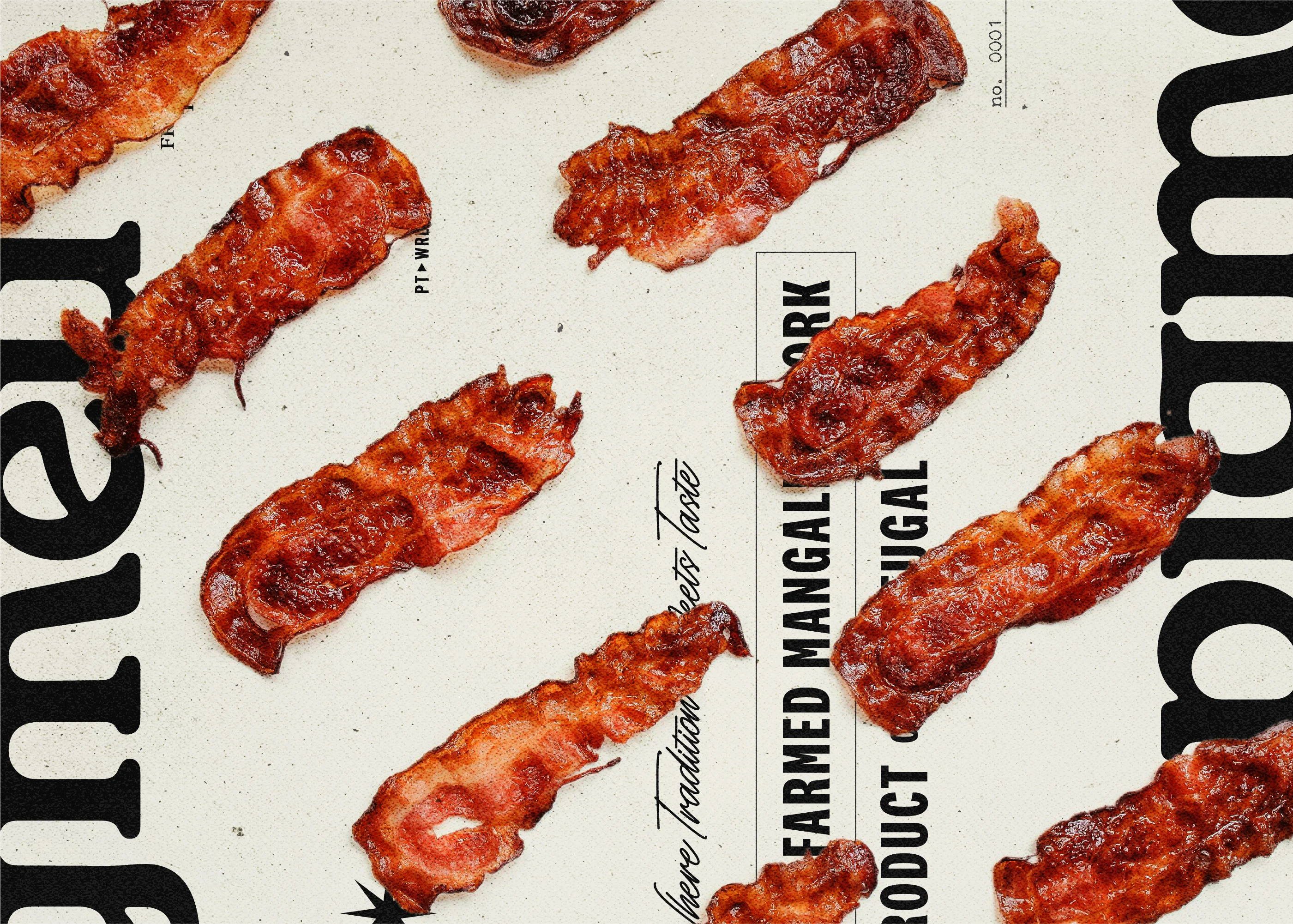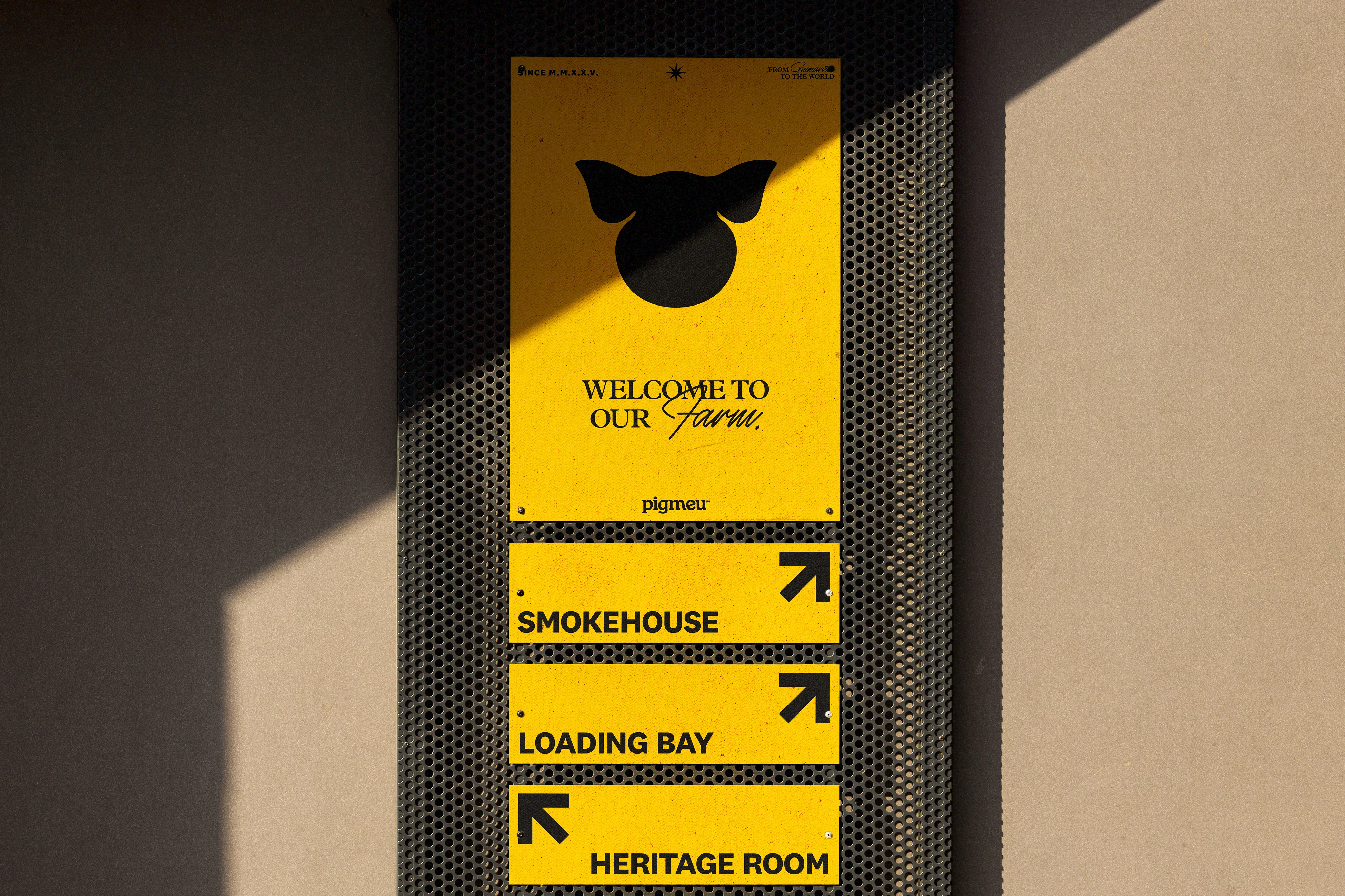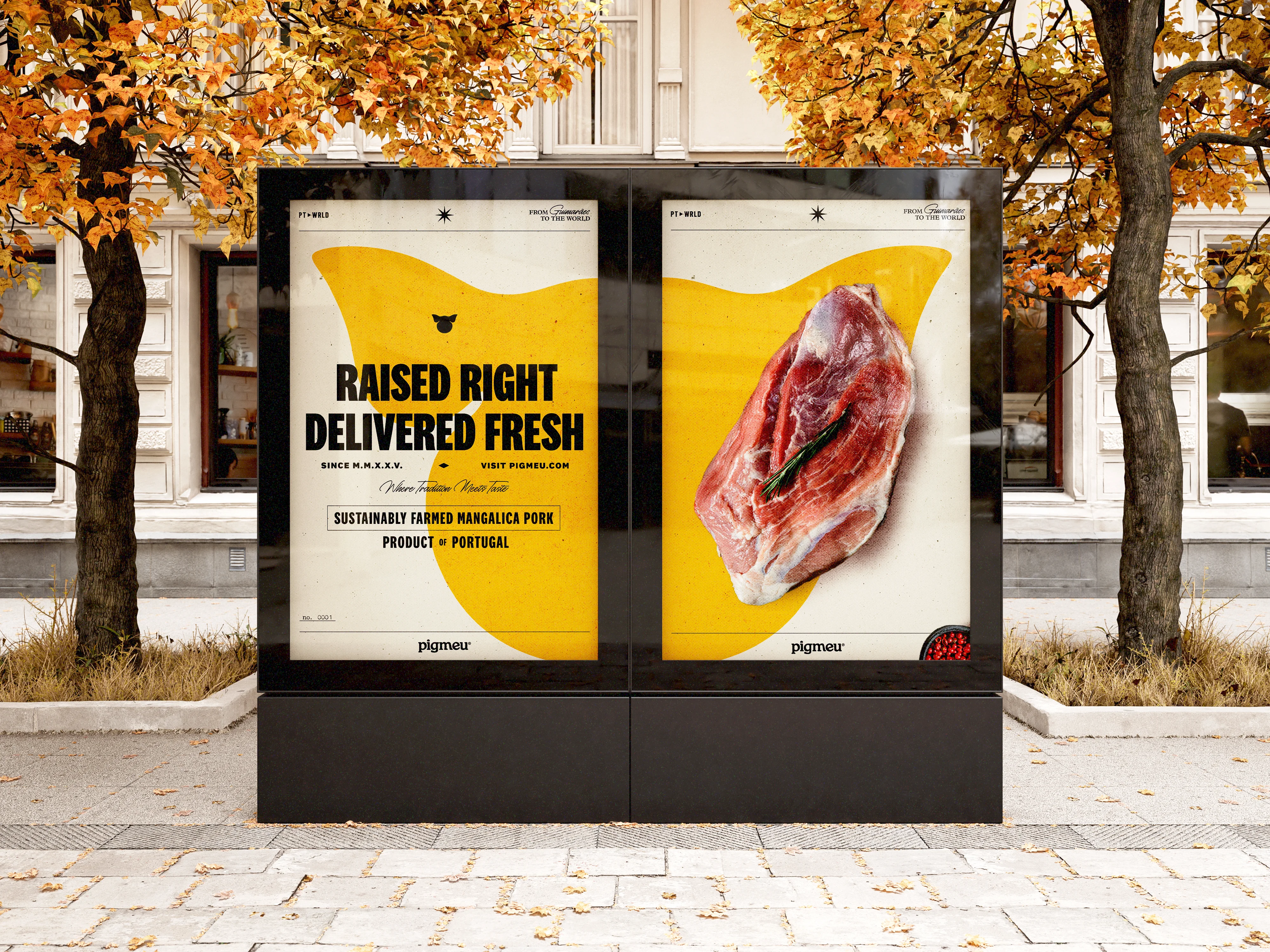 Pigmeu introduces a premium heritage breed to Portuguese consumers through a visual identity that refuses to blend in. In a category dominated by rustic, expected aesthetics, the brand leans into a bold letterpress-inspired system: compressed typography, grunge textures, and a color palette that feels more print shop than butcher counter. The tagline "Raised Right. Delivered Fresh." anchors the brand promise in craft and quality machine-printed aesthetic commands attention without relying on category clichés.